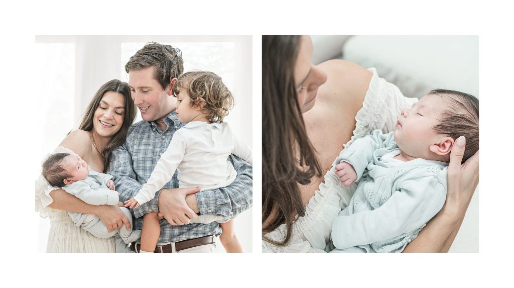 For most of the storytelling images, I used my 50mm f/1.4 lens, which is one of my favorite lenses for newborn and family photography. The focal length creates a natural perspective while the wide aperture produces a soft background blur that helps keep the focus on the baby and the emotional connection in the scene.
